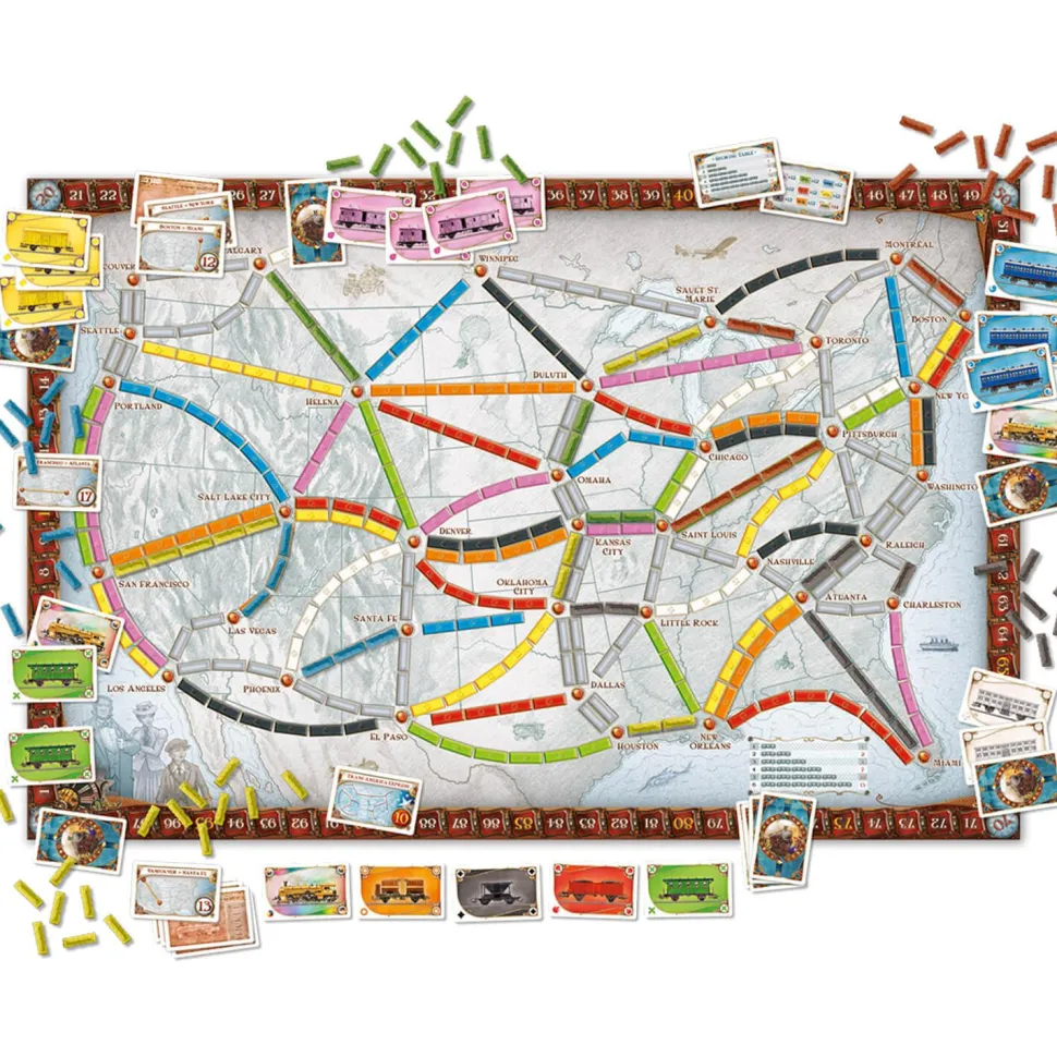 Les aventuriers du rail ont raflé les récompenses les plus prestigieuses ! As d’or à Cannes, Jeu de l’Année en Allemagne, ce jeu plaira au plus grand nombre. A jouer en famille comme entre copains. La conquête ferroviaire au XIXe siècle et du début du XXe a toujours été un sujet particulièrement apprécié par les créateurs de jeu. Les aventuriers du rail est un jeu luxueux dans la droite ligne de Crique des Pirates ou de Meurtre à l’Abbaye. Le graphisme dépeint avec bonheur les merveilleuses machines de la grande époque de l’histoire des chemins de fer et le matériel de jeu est de grande qualité. Les règles rapides à assimiler vous permettront de parcourir l’Amérique du Nord. En prenant le contrôle de lignes de chemins de fer reliant les différentes villes des États-Unis, vous accumulerez des points et plus les trajets seront longs plus ils seront lucratifs. Vous pourrez récupérer des points supplémentaires si vous arrivez à mener à bien des missions secrètes en reliant certaines destinations.. Attention ! vos partenaires vont tenter de vous mettre des bâtons dans les roues de locomotive…Il existe aussi Les aventuriers du Rail Europe (avec quelques variantes) Contenu de la boîte : – 1 plateau de jeu- 225 wagons miniature ( !)- 144 cartes en couleurs – marqueurs de score- 1 livret de règles en couleurs Durée d’une partie : de 30 à 45 minutes.(Un peu plus long à 5)De 2 à 5 joueurs À partir de 8 ans