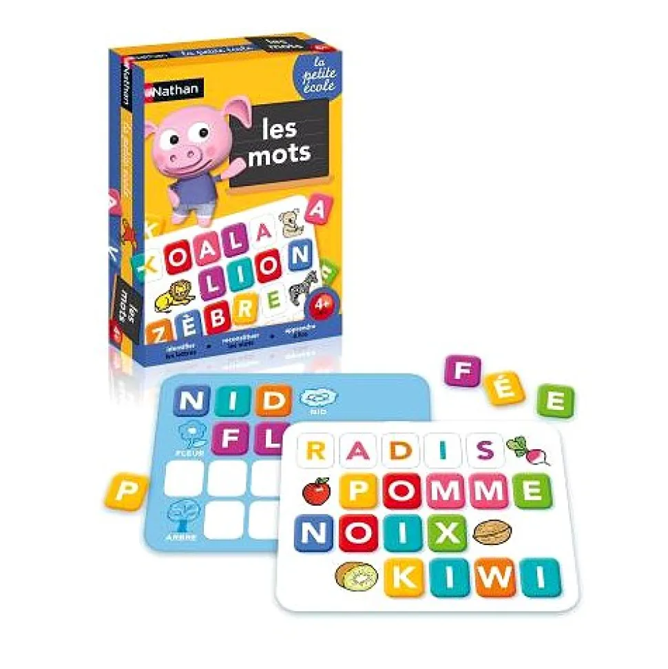 6 jeux progressifs pour apprendre à écrire ses premiers mots, en jouant seul ou à plusieurs.De grandes planches illustrées et des jetons aux couleurs très gaies.L’enfant compose des mots de 3 à 5 lettres en s’aidant du modèle : les animaux, les véhicules, la nature, les personnages…Contenu :- 6 planches de 4 mots (18.6 x 15 cm) recto verso- 108 jetons lettres- 1 guide de jeuxConçue par des professionnels de la petite enfance, la collection Petite Ecole propose une sélection de jeux sur les premiers apprentissages de la maternelle : lettres, chiffres, couleurs et formes, animaux et premiers mots. Dimensions de la boîte : 20 x 27.7 x 5.3 cm.