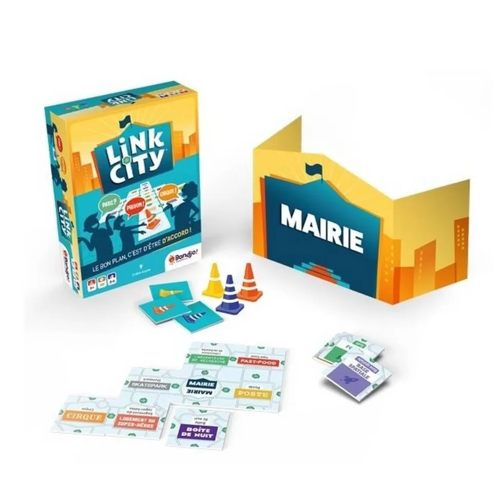 Link City se joue en 6 tours. À chaque tour, une personne différente joue le rôle de la mairie. Sa mission : agrandir la ville ! Mais… Ferez-vous les mêmes associations d’idées que la mairie ? Seule l’harmonie vous permettra de connecter un maximum de lieux pour réussir une ville unique et insolite !