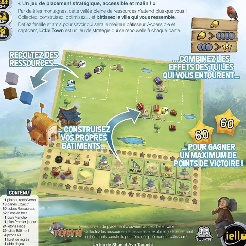Little Town est un jeu de stratégie et de placement d’ouvriers accessible et malin, destiné à être joué en famille et entre amis. Simple à prendre en main, sa profondeur permet à chacun de développer rapidement son propre style de jeu.
