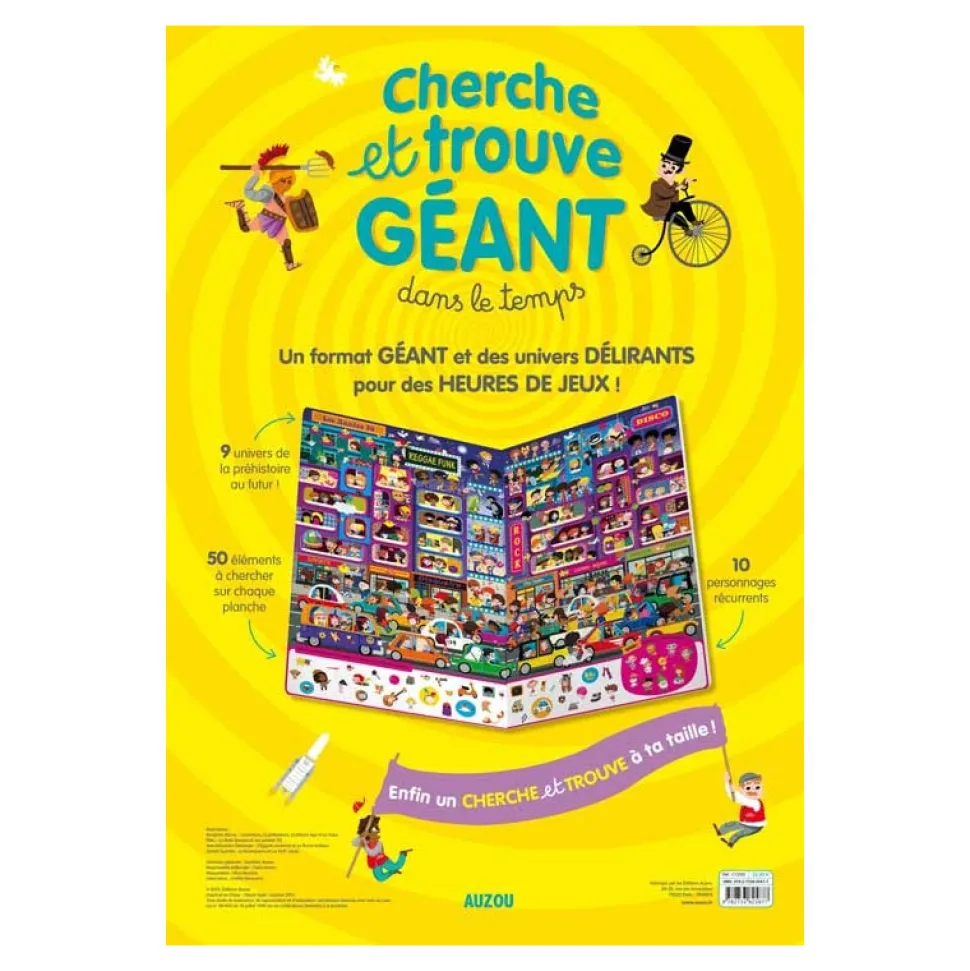 Pour des heures de jeu en famille !Un « Cherche et Trouve » en format géant, regroupant 50 éléments dont 10 personnages récurrents à trouver à chaque page. Parcourez 9 époques remplies de détails : Préhistoire, Égypte, Rome Antique, Moyen-âge, Renaissance, Versailles, Belle époque, Années 70 et futur.Grâce aux illustrateurs talentueux, vous aurez un bon sens de l’observation.Nombre de pages : 18.Largeur : 46,6 cm.