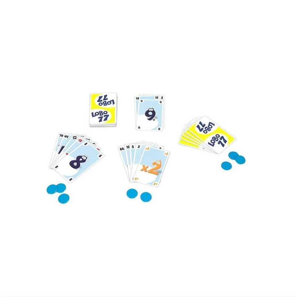 Lobo 77Les joueurs reçoivent cinq cartes. A tour de rôle, ils jouent et comptent leurs cartes-points: 10, 20, 30, 32… Mais attention à ne pas dépasser 77, autrement on a perdu! Il s’agit pour cela d’utiliser les cartes d’action à bon escient.Contenu de la boîte : – 56 cartes, – 24 jetons, – 1 règle du jeu.Durée d’une partie : 30 minutes. De 2 à 8 joueurs.