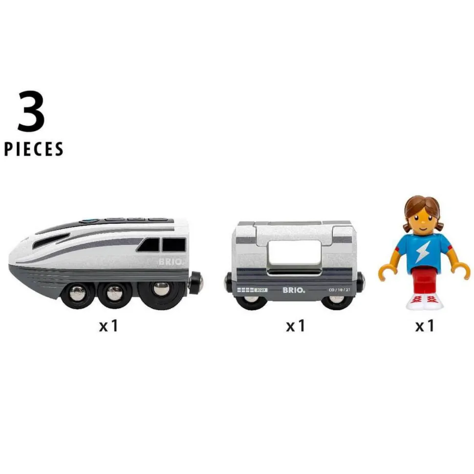 Passez à la vitesse supérieure avec la locomotive à piles Super Rapide. Il vous suffit d’appuyer sur le gros bouton turbo et ce train à piles va deux fois plus vite, ce qui fait de lui le train le plus rapide du BRIO World. La poussée turbo dure 5 secondes et, tandis que le train va à toute vitesse, les lumières blanches sur les côtés de la locomotive deviennent bleues. Cette locomotive à l’allure futuriste dispose d’un wagon qui accueille un passager chanceux de profiter du voyage.
