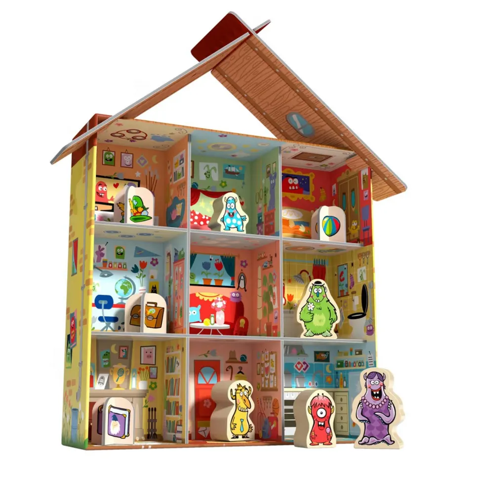 Contenu: 1 maison (= fond de la boîte illustré), 1 ensemble de murs et planchers (en 4 parties qui s’emboîtent), 1 toit (en 2 parties), 5 monstres en bois robustes et durables, 4 objets fétiches, 1 livret avec 60 missions et solutions, 1 règle du jeu.