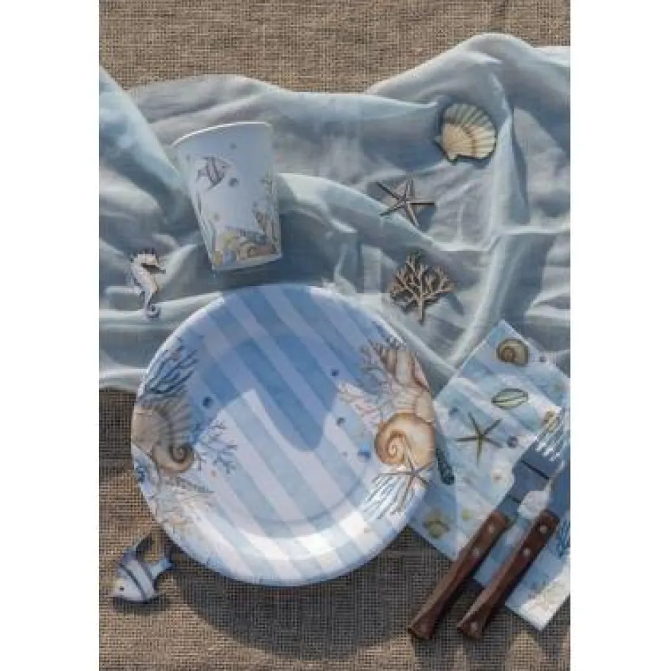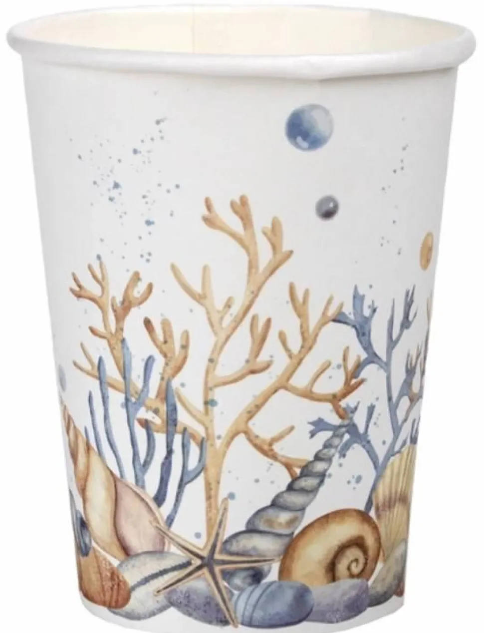 Sachet de 10 Gobelets Coquillages en carton, illustration coquillages marins, corail, fond des mers.