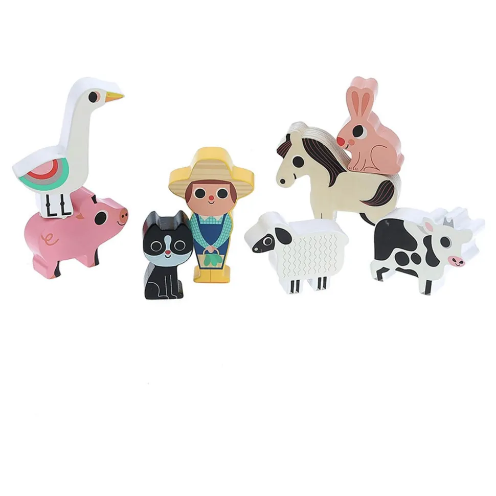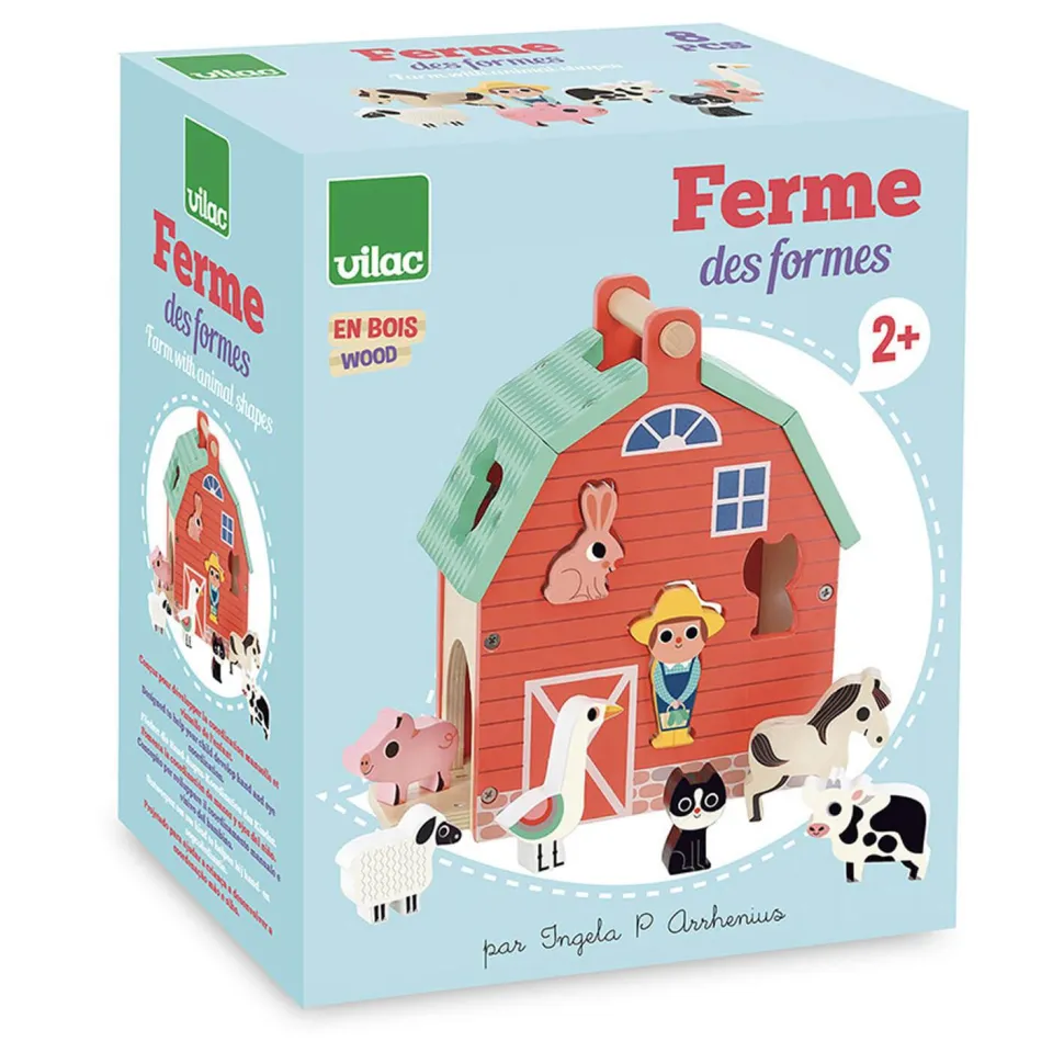 Bienvenue à la ferme des formes, de la marque Vilac et imaginée par l’illustratrice Ingela P.Arrhenius, où vous retrouverez huit personnages en bois à encastrer !