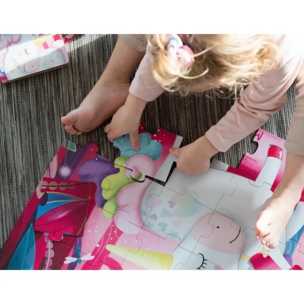 Une crinière aux couleurs de l’arc-en-ciel, une corne dorée et des ailes scintillantes : découvre l’univers magique et enchanteur des licornes ! Grâce à ce coffret illustré avec soin, votre enfant partira à la rencontre de créatures féeriques à travers un grand puzzle à assembler et un livre cartonné plein d’histoires tendres et colorées. Le puzzle aux détails lumineux plonge l’enfant dans un monde merveilleux peuplé de licornes, d’arc-en-ciel et de paysages enchantés. Quant au livre, il stimule l’imagination et enrichit le vocabulaire à travers une narration poétique. Un moment d’évasion magique, idéal pour développer concentration et sens de l’observation.