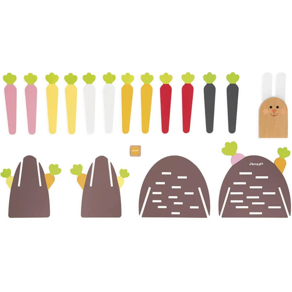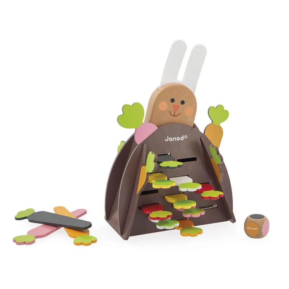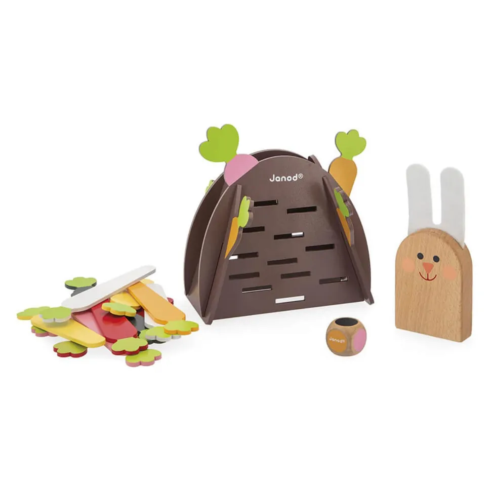 Contient : 1 terrier, 1 lapin en bois et feutrine, 12 carottes en bois de couleurs différentes et 1 dé en bois. Jeu de société en bois issu de forêts gérées durablement, certifiées FSC®.