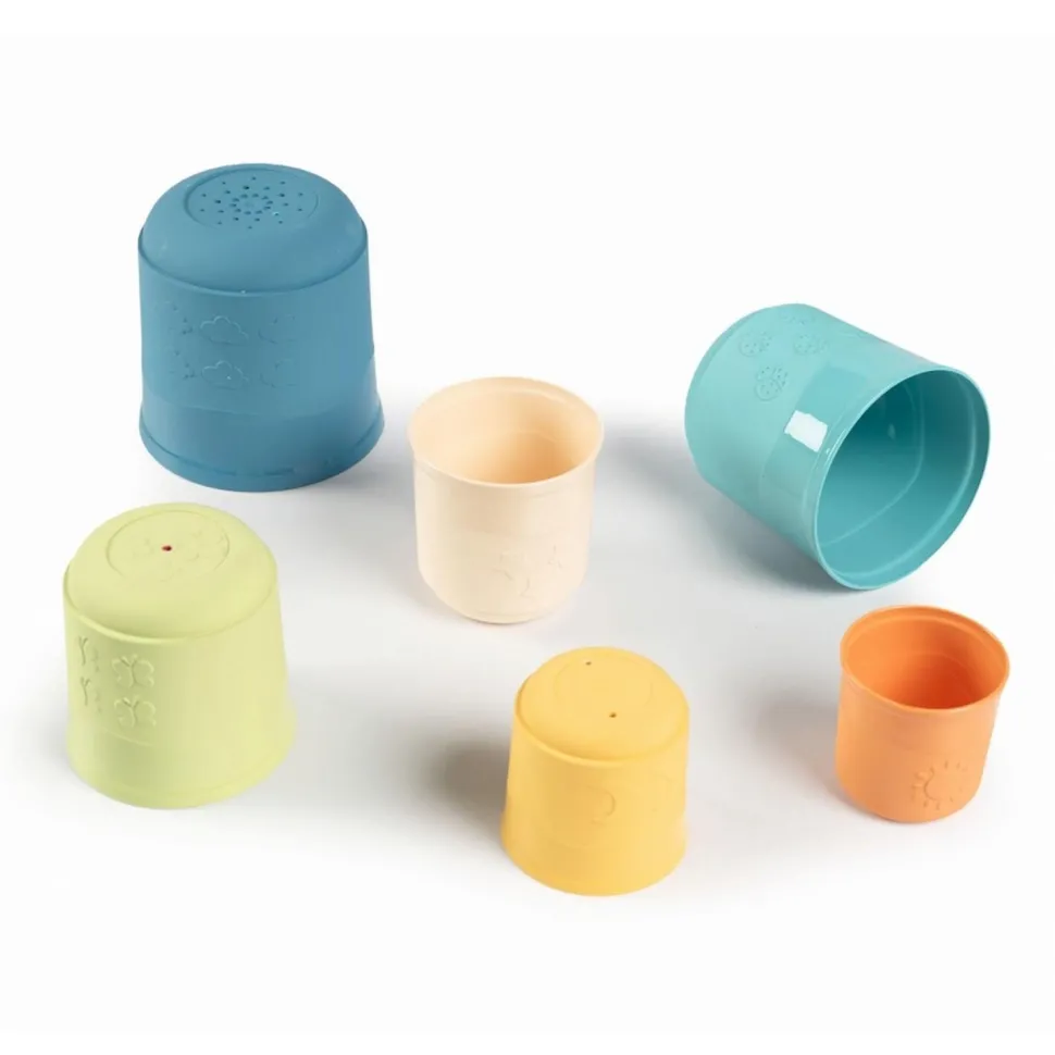 Ludiques, les 6 gobelets sont attractifs, faciles à prendre en main et à empiler. Ils permettront d’apprendre aux enfants à reconnaitre les couleurs. Les gobelets sont orange, jaune, beige, vert, bleu clair, bleu foncé dans des tons pastels pour de la douceur.