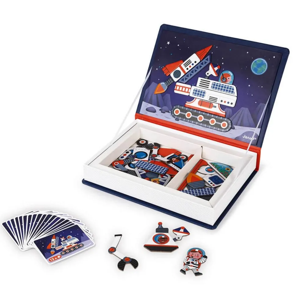 Ce jeu en carton transportera les petits à partir de 3 ans dans l’univers fascinant de l’espace et des planètes grâce à 52 magnets et 18 cartes. A l’intérieur, une scène magnétique permet de recomposer le véhicule spatial indiqué sur la carte à l’aide des magnets. L’enfant pourra également s’amuser à mélanger les différentes pièces entre elles pour créer des scènes rigolotes puisqu’elles sont toutes interchangeables ! Permet à l’enfant d’améliorer son imagination et sa motricité fine.