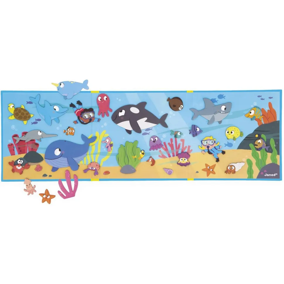 Ce jeu magnétique se compose d’un décor aimanté ainsi que de 30 magnets. La motricité fine, au cœur des premiers apprentissages de votre enfant, sera développée par la préhension des pièces aimantées. L’imagination ne sera pas en reste, chaque magnet une fois plongé dans le décor invite l’enfant à se créer ses propres histoires. Les poissons colorés sont en fête, les étoiles de mer se lancent des regards amusés, les plongeurs sont surpris par tant d’animation et de diversité … Un grand nombre de scénarios amusants viendront prendre vie dans la tête de votre bambin ! Chouette, le décor peut se dresser verticalement, permettant à votre enfant de vous conter ses histoires ! De plus, ce même décor est pliable, facilitant son transport : plus aucunes barrières (à part la Grande Barrière de Corail) ne se dresseront devant l’imagination de votre enfant. Cette planche aimantée fait partie de la grande collection des Magnéti’stories, de véritables invitations à l’imagination et la rêverie.