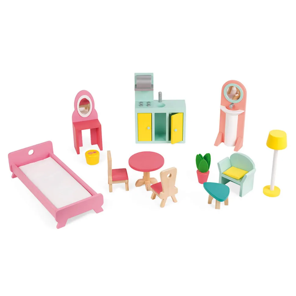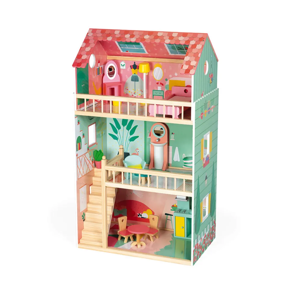 Dans cette superbe maison de poupées il y a tellement d’histoires à imaginer ! Joliment décorée et livrée avec son mobilier assorti, elle comporte 3 étages correspondant aux pièces de la maison desservies par un escalier : la cuisine au rez-de-chaussée, un petit salon et une salle de bain au 1er étage, et une chambre au dernier étage.Pratique, la découpe du toit a été pensée pour mieux accéder au dernier étage. La maison est compatible avec des personnages allant jusqu’à 30 cm (non inclus). Cette maison contient 12 pièces de mobilier : 1 lit, 1 lavabo, 1 coiffeuse, 1 cuisine, 1 table, 2 chaises, 1 fauteuil, 1 lampe, 1 table basse, 1 tabouret et 1 plante verte. Dimensions : 60,8 x 37,9 x 105,3 cmNote : Maison à monter soi-même.Poupée non incluse.