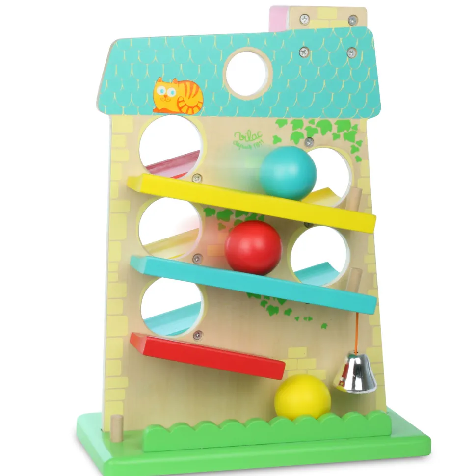 Une jolie maison en bois amusante avec des boules qui roulent, tombent et font sonner la cloche !Contenu :- 1 maison en bois- 3 boules en bois de couleur rouge, bleu, et jaune- 1 cloche en métalCette maison en bois joliment décorée est constituée en étage avec une cheminée au sommet et 3 rampes de couleur jaune, bleu et rouge. La façade est percée de 5 ouvertures rondes par lesquelles les boules pourront passer. Dans ce jeu, les boules en bois glissent depuis le sommet, dégringolent le long des rampes et font tinter la cloche en arrivant en bas. Destiné aux enfants à partir de 1 an, ce jeu éducatif est conçu pour développer sa coordination manuelle et visuelle.Dimensions de la maison : 35 cm de hauteur x 26,5 cm de largeur.Dimensions de la boite : 35,5 x 26,5 x 14 cm.