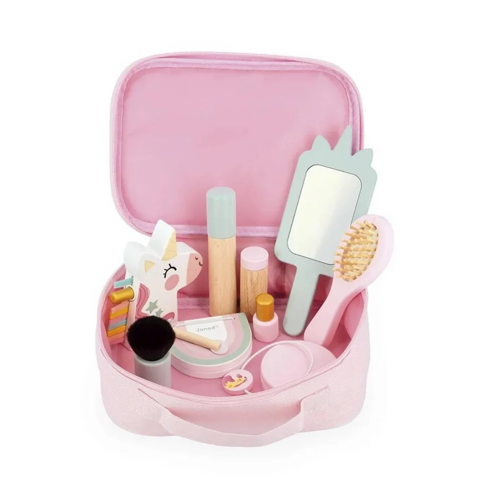 Trop drôle : la licorne tire la langue quand on appuie sur sa crinière, quelle chipie ! Tous les accessoires se rangent dans la belle mallette zippée, pour facilement les transporter et être toujours disponible pour bichonner les autres, ou soi-même. Les accessoires de maquillage en bois sont des jouets et non des cosmétiques.