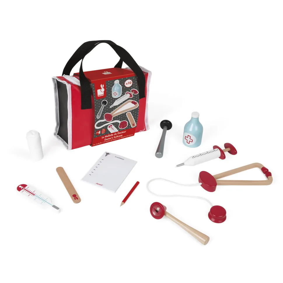 Les futurs médecins apprécieront cette mallette ou tout le nécessaire est réuni pour soigner les malades et leur prescrire le traitement qui les mènera à la guérison. Contenu de la mallette du Docteur : – 1 seringue, – 1 marteau pour les réflexes, – 1 bouteille de désinfectant, – 1 stéthoscope, – 1 otoscope loupe, – 1 thermomètre, – 1 languette, – 1 calepin d’ordonnance, – 1 crayon de papier,- 1 rouleau de bandage.Le téléphone du cabinet médical a sonné, une urgence ! Le docteur saisit sa mallette et part porter secours à cette personne en difficulté. Arrivé sur place, il parle au malade, le rassure, l’ausculte. Il prend son stéthoscope et écoute les battements de son coeur : Tout va bien. Il regarde si le sujet a de bons réflexes avec le marteau : Tout va bien…. Il termine sa consultation par rassurer le patient et lui prescrire quelques médicaments sur une ordonnance ! Dimensions de la mallette : 24 x 9,5 x 16,5 cm.