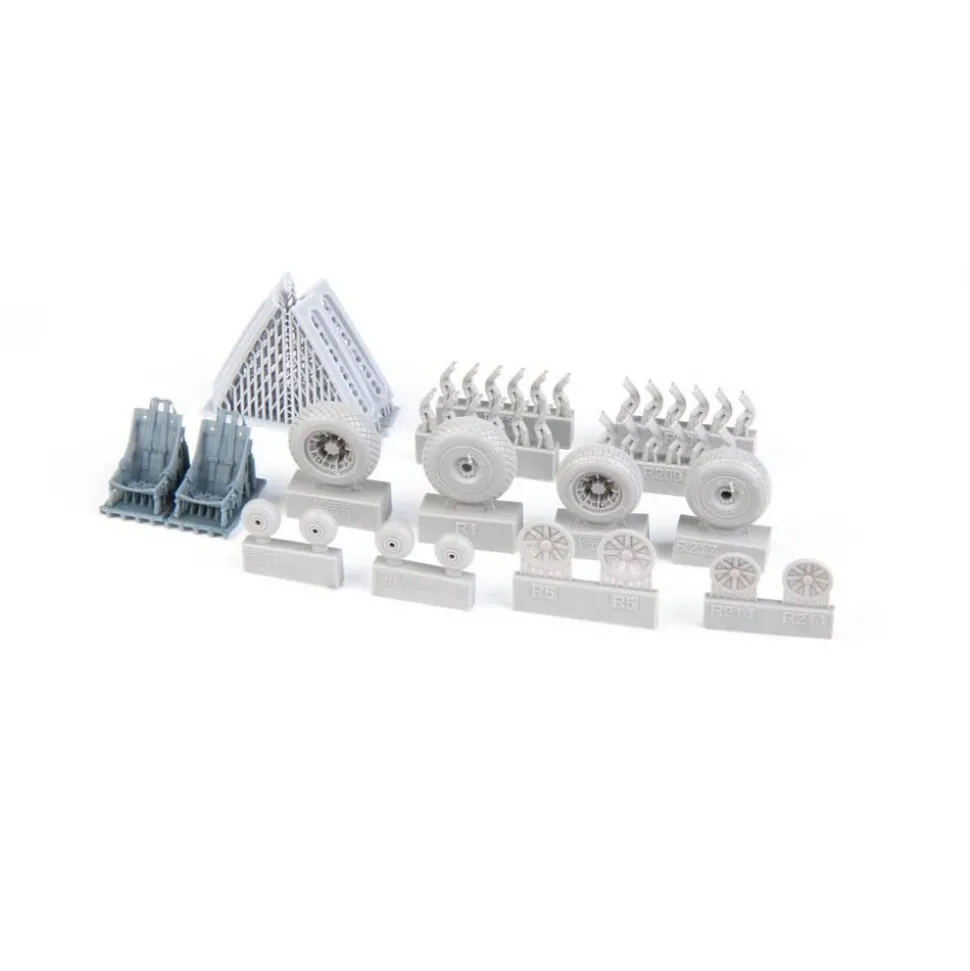 – Pièces en résine : oui (échappements – un type, deux jeux ; roues du train d’atterrissage principal – deux options, un jeu de chaque type ; siège avec harnais moulé – une option, deux jeux)