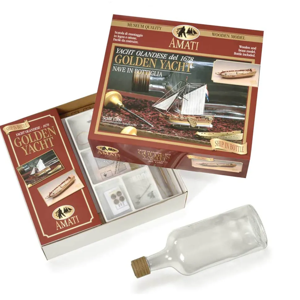 Assemblez cette sublime maquette de bateau en bois dans une bouteille de la marque Amati reproduisant un Yacht hollandais de 1678.