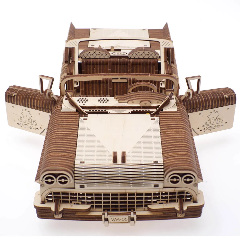 Pièce après pièce assemblez cette superbe maquette en bois réplique d’une voiture cabriolet !Ce puzzle 3D mécanique signé Ugears-Models est un hommage très détaillé et extrêmement réaliste des temps forts de l’industrie automobile des années 50.Le plaisir de construire cette maquette en bois ne s’arrête pas qu’à son design. Composé de 739 pièces, ce modèle est équipé d’un moteur à élastiques qui alimente le mécanisme et entraîne la voiture. Le Cabriolet VM-05 peut avancer ou bien reculer. Pour vous permettre de regarder de près le magnifique moteur de configuration en V à huit cylindres en fonctionnement, il existe un mode “veille”. Dans ce mode, votre Cabriolet restera immobile, vous permettant de regarder sous le capot pour apprécier la beauté des engrenages en mouvement.Si vous souhaitez mettre votre véhicule en mouvement, tirez le levier de transmission sur la colonne de direction. Les roues avant et arrière du modèle sont suspendues pour rendre la conduite parfaitement lisse. Ce modèle mécanique entière fabriqué en bois issu de sources durables et dont les pièces sont découpées au laser est adapté pour les plus de 14 ans. Assemblage sans colle.Dimension du modèle : 35 x 15.7 x 9 cm.Durée d’assemblage : 13 heures environ.