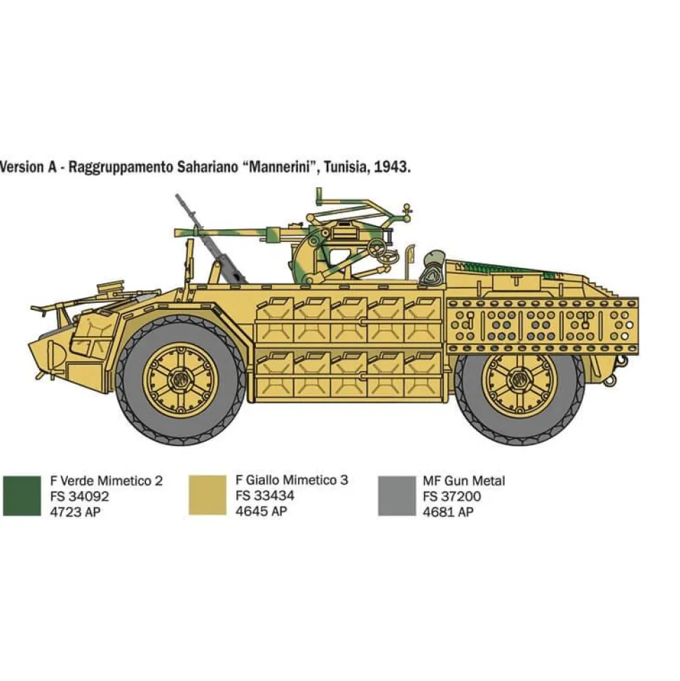 Maquette en plastique à assembler de véhicule militaire italien de la Seconde Guerre Mondiale. Longueur de la maquette assemblée : 17.5 cm. Niveau de difficulté : 5.Peintures recommandées : – UA008 (vert foncé)- UA080 (jaune mimétique)- UA088 (marron mimétique)