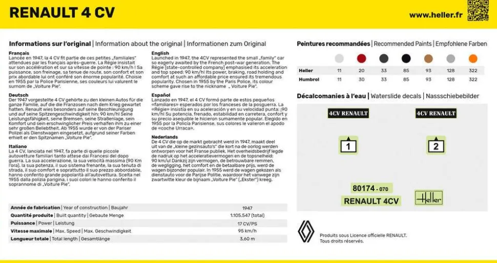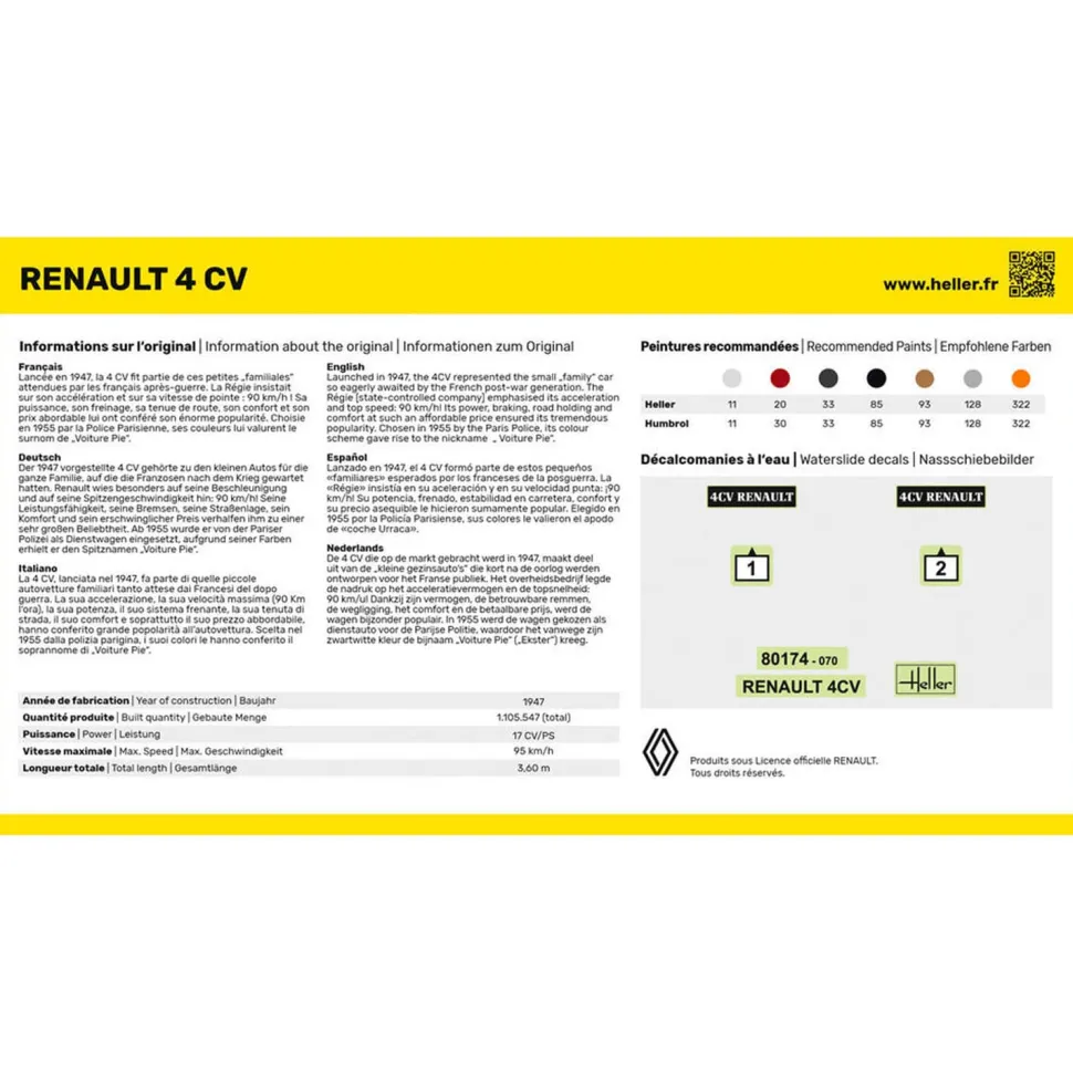 Maquette à assembler et à peindre du modèle Renault 4 CV à l’échelle 1/43.La « RENAULT 4 CV » est présentée au premier Salon de Paris d’après-guerre, en octobre 1946.Ébauchée sous les bombardements, achevés dans une France encore rationnée, la petite «voiture pour tous » de l’ingénieur Ferdinand Picard sera le véhicule de la liberté retrouvée et d’une vie meilleure. A la fois familiale et citadine, petite routière robuste, sobre et pas chère, la 4CV sera la première automobile française à dépasser le cap du million d’unités produites: 1 105 547 en 14 ans de carrière.Contenu du kit :- 1 maquette (40 pièces)- peintures principales- 1 pinceau – 1 colle – 1 plan de montageLongueur de la maquette assemblée : 8.5 cm.Largeur de la maquette assemblée : 3.3 cm.