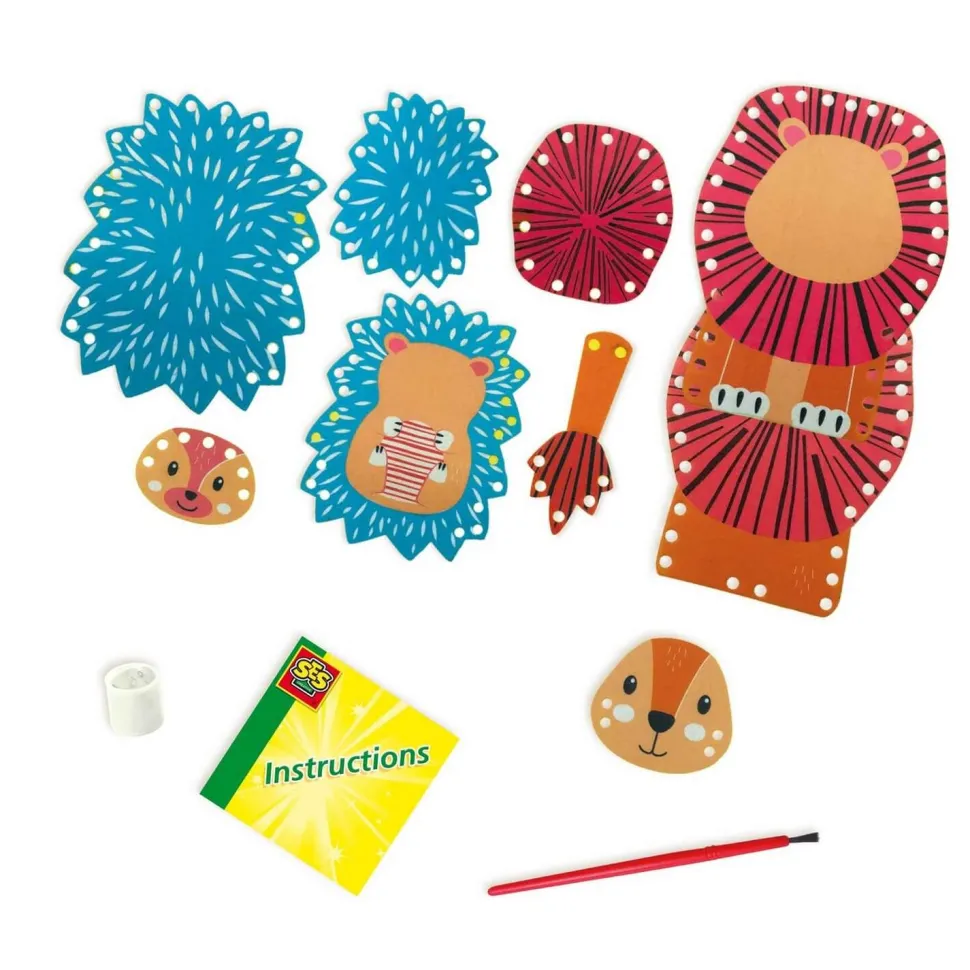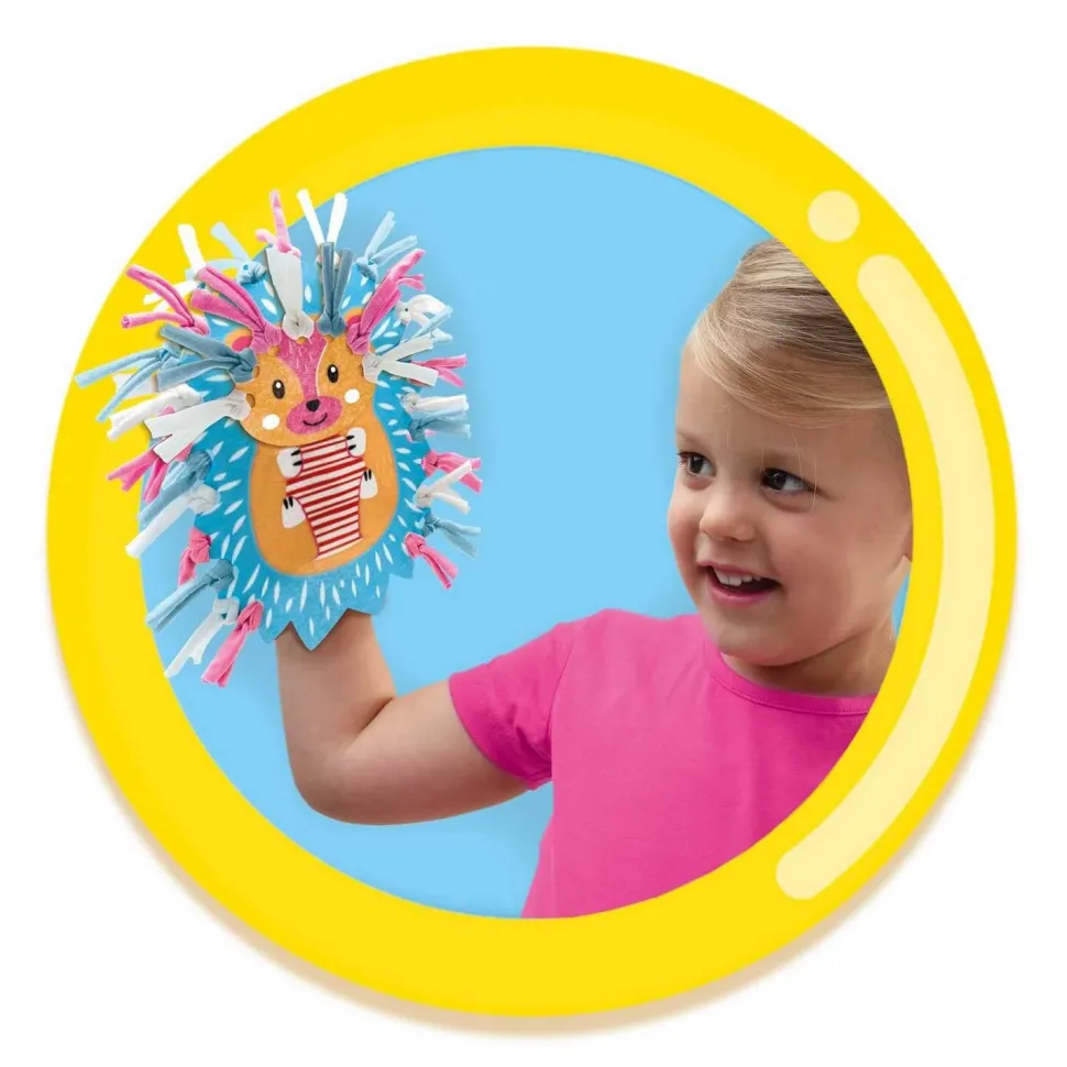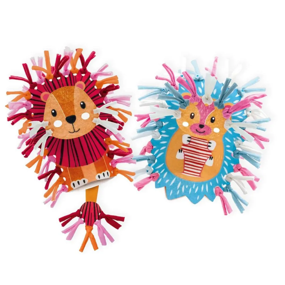 Votre jeune créatif pourra fabriquer deux jolies marionnettes facilement. Et comme nous sommes soucieux de leur sécurité, ils pourront élaborer celles-ci sans fil, ni aiguille. Le lion et le hérisson sont faits de différentes pièces en feutrine. La crinière du lion et les pics du hérisson peuvent être fabriqués à partir des cinq couleurs de fil de T-shirt. Votre enfant pourra donner vie aux animaux et partir en aventure en leur compagnie !