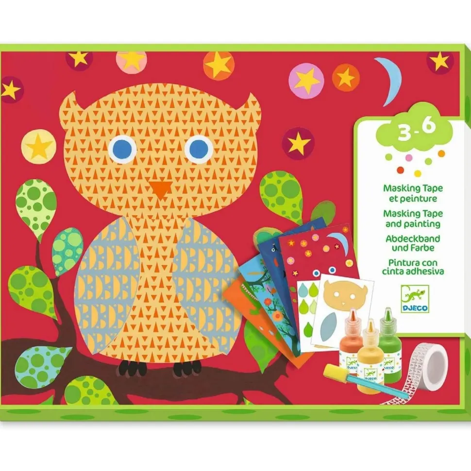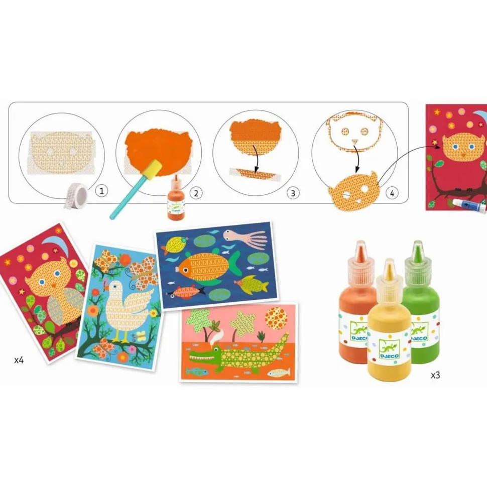 Après avoir protégé la table avec le tapis fourni, votre enfant pourra pleinement s’amuser à créer 4 animaux colorés avec du relief grâce à la peinture et au masking tape. Une fois les formes peintes, décollez les rubans de masking tape et collez les formes sur les tableaux illustrés