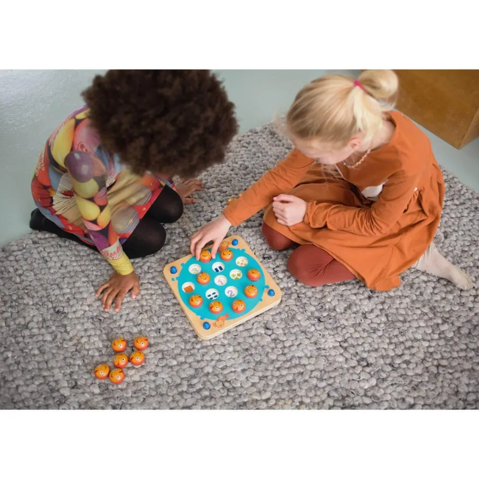 Ce n’est pas 1 jeu de mémo, mais il y en a 8 différents ! Soulève le poisson pour trouver les images qui vont ensemble. Change les cartes en dessous du plateau pour jouer à un autre jeu. Qui récoltera le plus de poissons ?