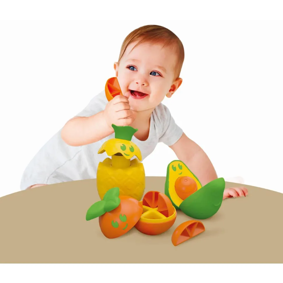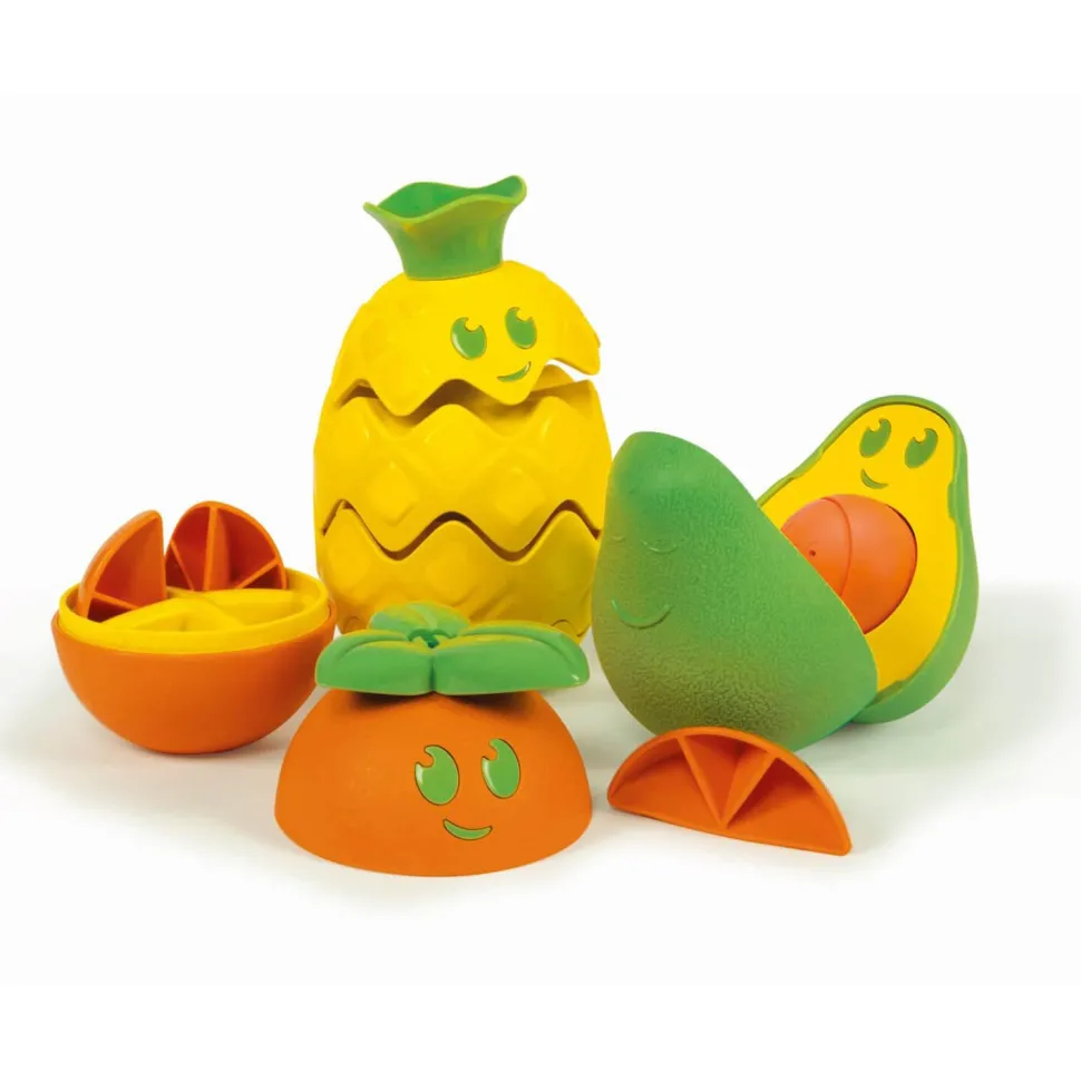 L’avocat s’ouvre et renferme le noyau à retirer et à réinsérer. L’ananas est composé d’éléments empilables. L’orange s’ouvre et cache 4 quartiers à extraire puis à ranger.