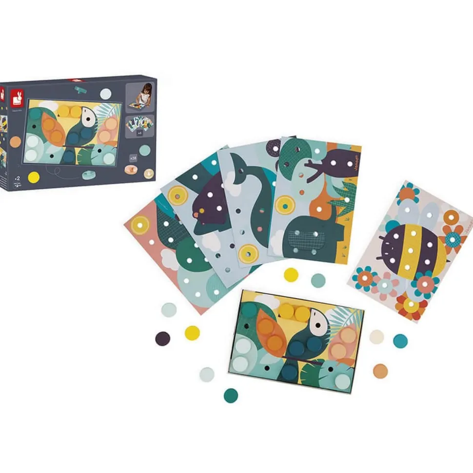 Pas besoin de colle, c’est une activité que les enfants prendront plaisir à recommencer encore et encore ! Un jouet d’éveil qui contient : 6 cartes perforées en carton et 38 pièces en bois.