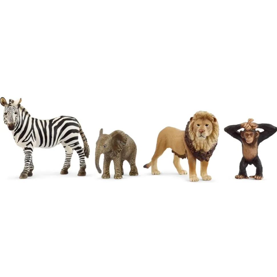 Contient : 1 x lion, 1 x zèbre, 1 x éléphanteau d’Afrique, 1 x jeune chimpanzé