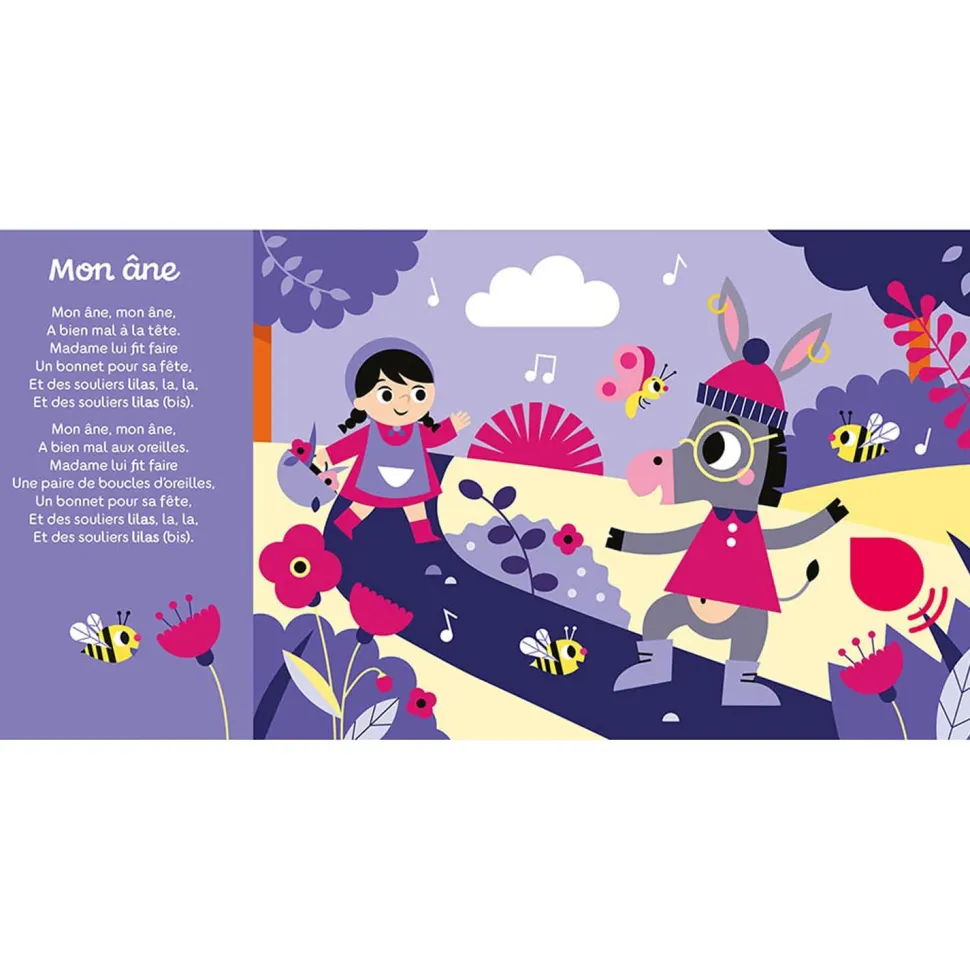 Découvrez le livre musical de la marque Auzou !Un livre tout-carton sonore pour écouter et danser sur 6 comptines bien connues, tout en apprenant les couleurs, premières notions d’apprentissage.Liste des comptines :- Mon âne- La chanson des couleurs- Coccinelle demoiselle- Vole joli papillon- Éléphant blanc- Petite poule griseContenu : 6 sons.Piles incluses A partir de 2 ans.