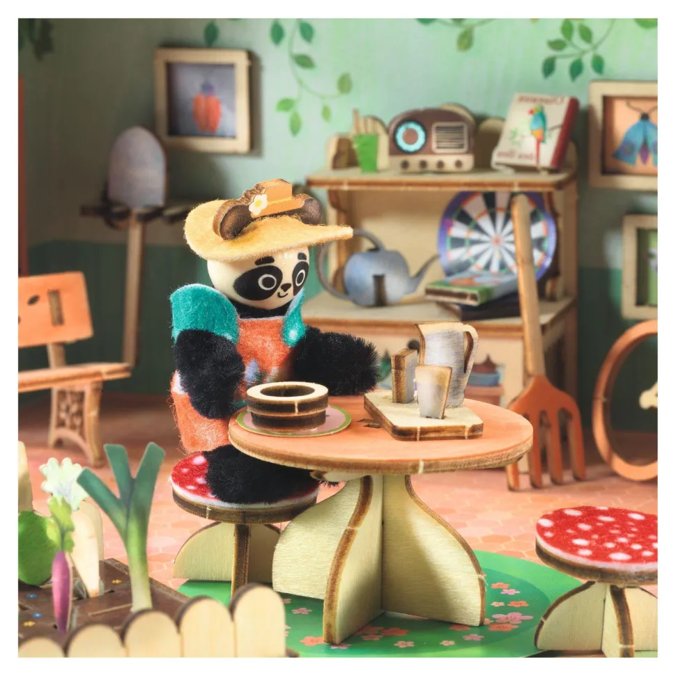 Contenu : 1 petite maison (dimension fermée : 14,5 x 16,5 x 5 cm), 2 planches en bois lasérisé, 1 palette de peintures sèches et 1 pinceau, 1 nappe de protection, 3 planches de carte prédécoupée illustrée, 3 planches de stickers (1 planche de stickers illustrés, 1 planche de petites gommettes transparentes, 1 planche de stickers double face en mousse), 4 fils chenille, 1 tête et des oreilles illustrées en bois, 1 bobine de fil, 1 planche de feutrine illustrée préd