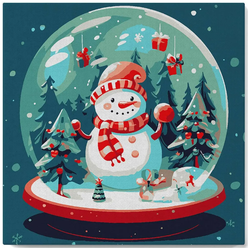 Caractéristiques détaillées : Mini peinture au numéro : Bonhomme de Neige dans sa Boule – toile tendue sur chassis