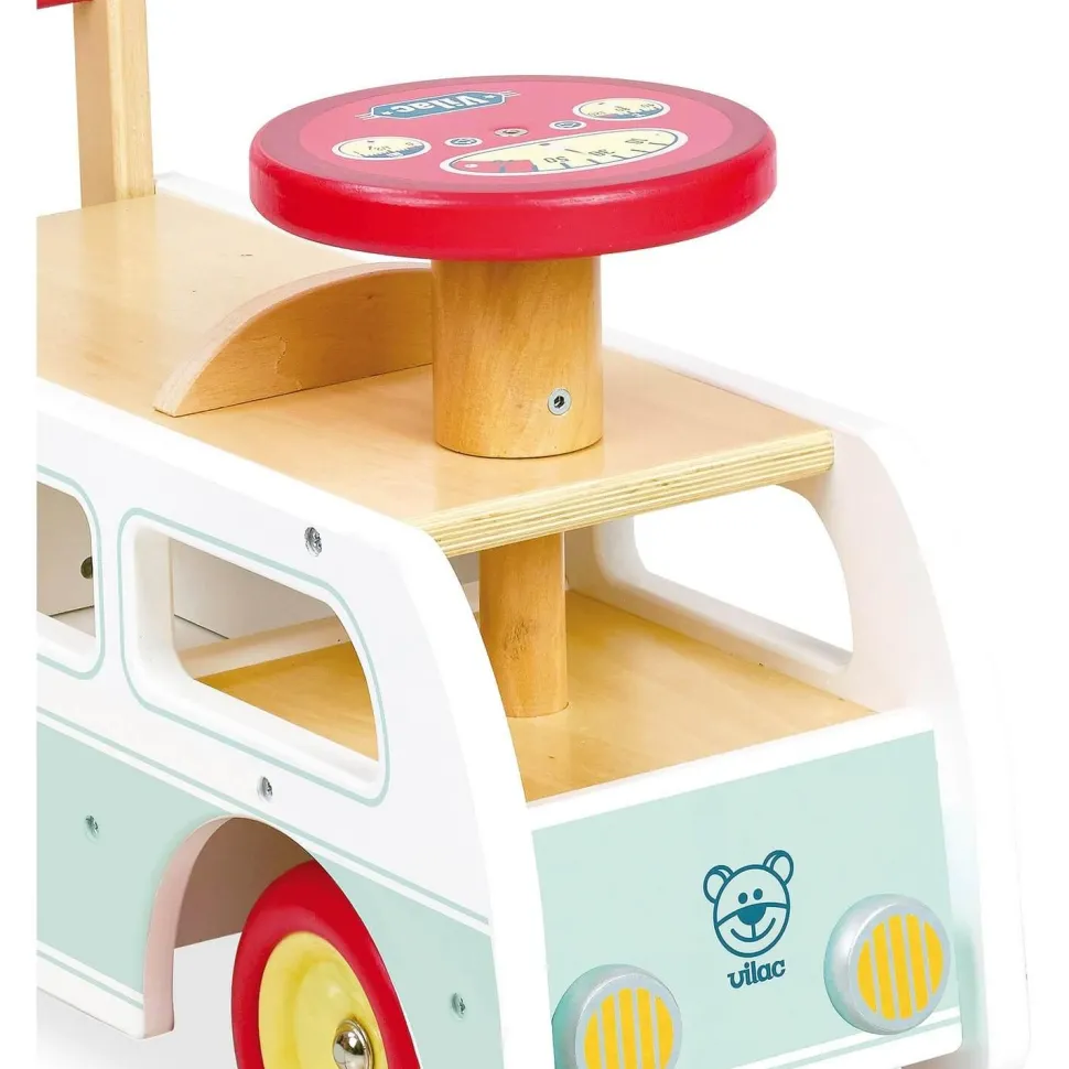 Un magnifique chariot de marche et un porteur en bois en forme de minibus retro pour les enfants à partir de 18 mois.