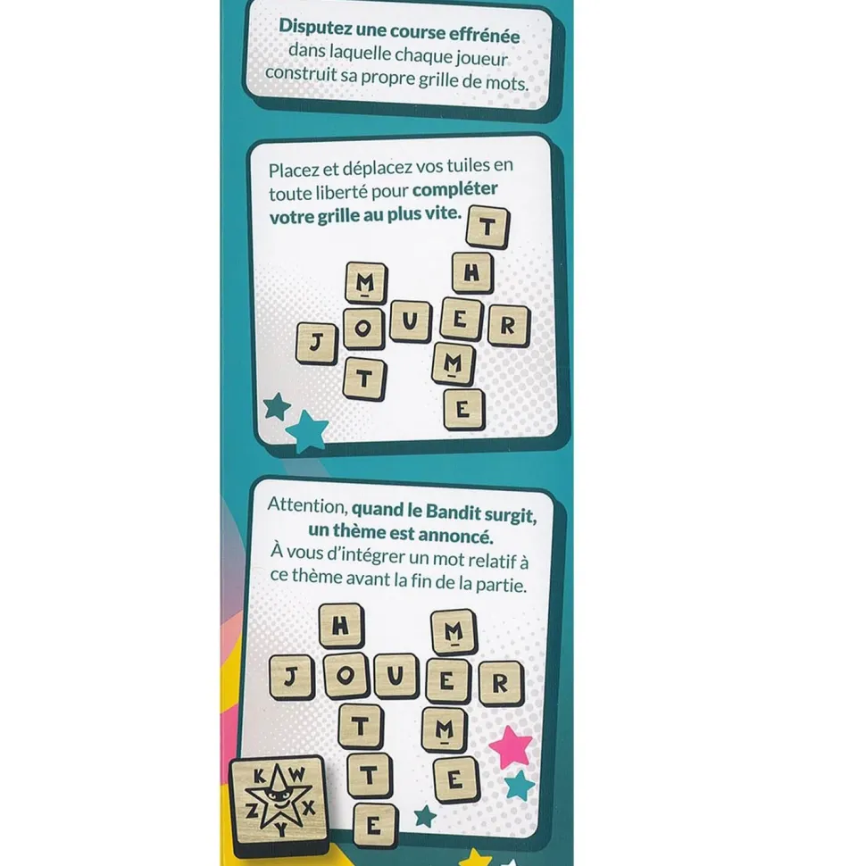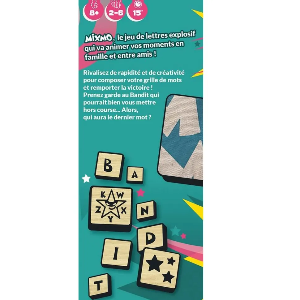 Vous en avez assez des jeux de lettres traditionnels ? Essayez Mixmo, le jeu de mots croisés le plus rapide et le plus excitant de tous les temps ! Le voilà de retour dans un pack et un format renouvelés, parfaits pour se retrouver pour un moment amusant ! Un jeu de mots croisés passionnant au rythme effréné : rivalisez de rapidité et de créativité pour composer votre grille de mots et remporter la victoire ! Prenez garde au bandit qui pourrait bien vous mettre hors course … Alors, qui aura le denier mot ?