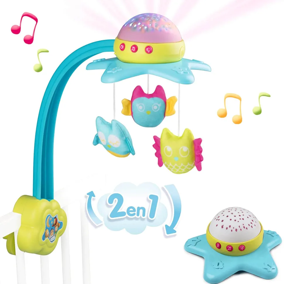 Utilisable dès la naissance, ce joli mobile en forme de d’étoile embellira la chambre de votre enfant et l’aidera à s’endormir en douceur grâce à ses 3 hiboux et ses 4 sons (3 berceuses et 1 ambiance neutre).