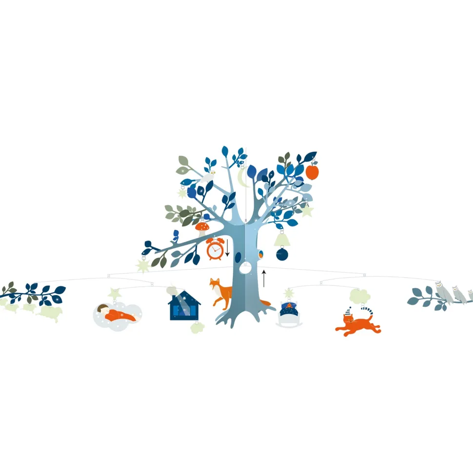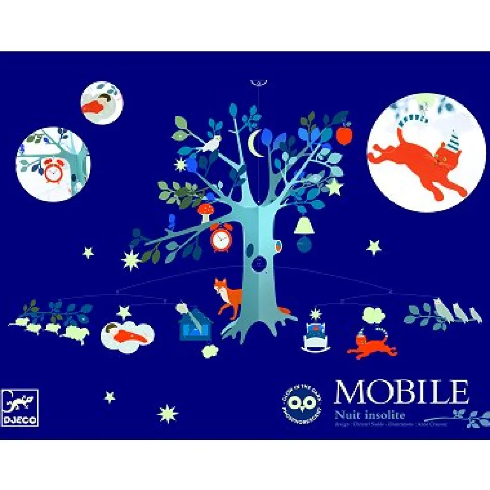 La collection Djeco Mobiles, une rencontre poétique et aérienne entre deux mondes : le design et l’illustration pour enfants. Un subtil jeu d’équilibre entre rêve et réalité. Le mobile « Nuit insolite » est phosphorescent la nuit.Il fait partie de la collection « Céleste » de Djeco, qui comprend également une étagère en bois, un abat-jour, du papier peint et des stickers muraux … bref, tout ce qu’il faut pour conférer une authentique « atmosphère » à la chambre de votre enfant.Design : Christel SaddeMatière : Carton, papier, fil métallique. Dimensions du mobile assemblé : 80 x 48 cm. Dimensions de la boîte : 40 x 30 cm.