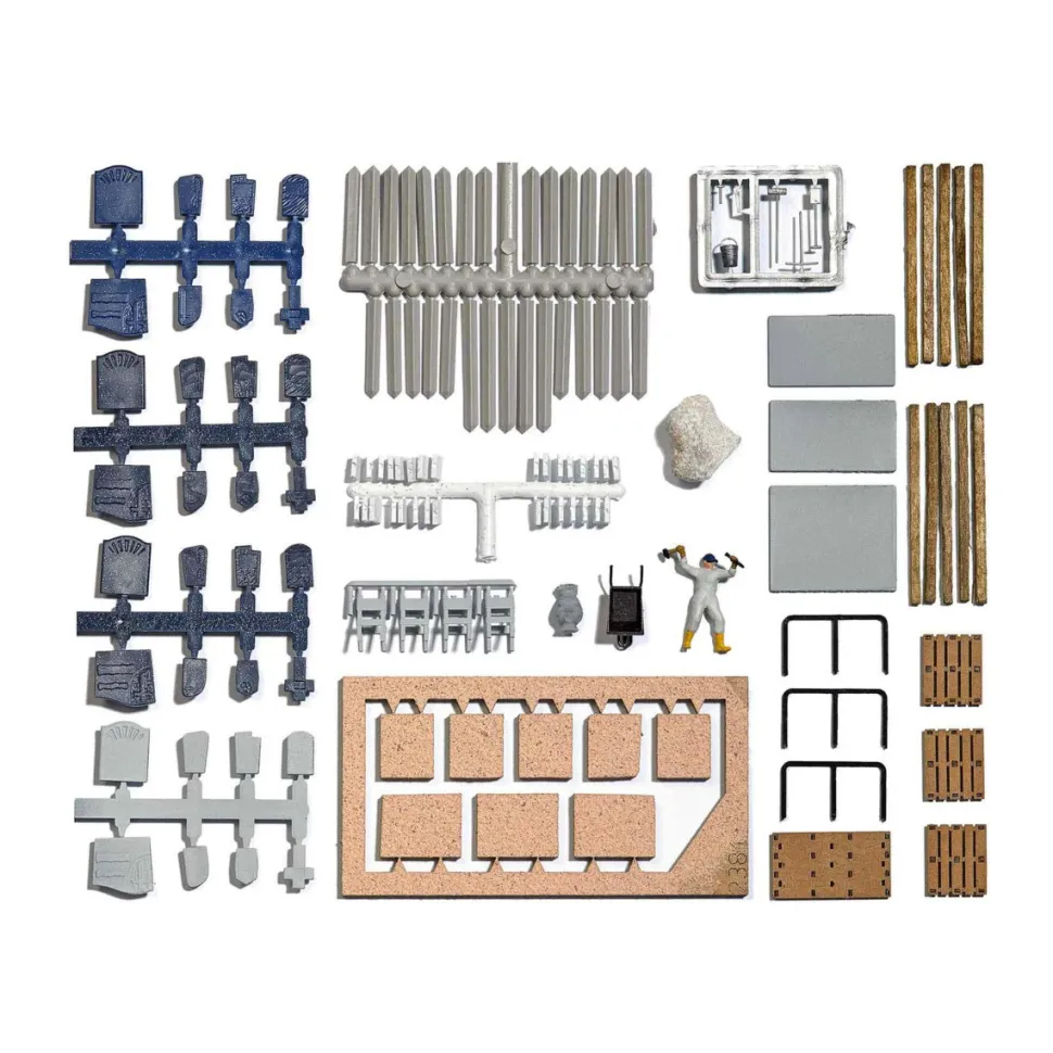 Busch 1091 vous propose ce kit d’assemblage d’une marbrerie.Contenu :- figurine de tailleur de pierres- grande urne- bois de construction- palettes- stèles en béton- outils- pierres tombales- bâti pour le transport- blocs de pierres- supports pour la présentation de modèles de pierres tombalesLa marbrerie s’occupe de la transformation des blocs de pierre issus des carrières, en plaques de pierre qui sont polies pour devenir le marbre.Echelle HO (1/87)