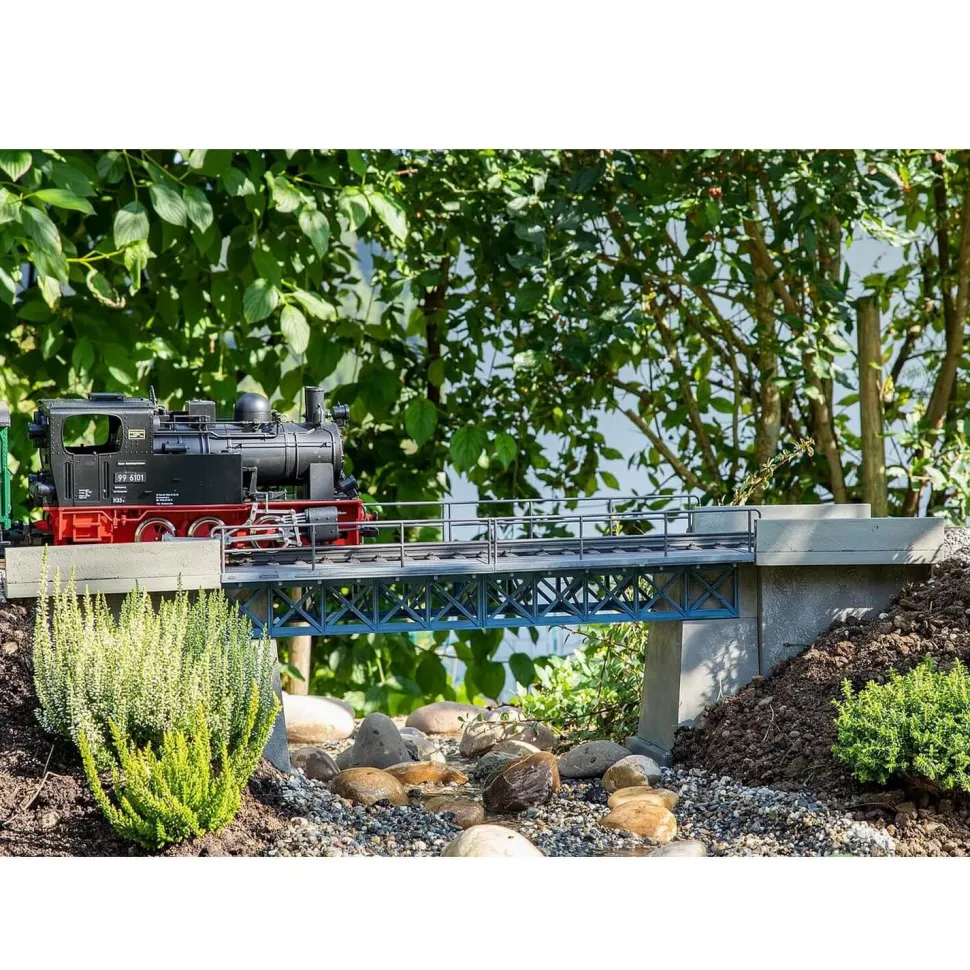 Accessoire de modélisme G de la marque Faller. La marque vous proposeun pont de chemin de fer à une voie avec poutres en treillis et têtes de pont en béton.