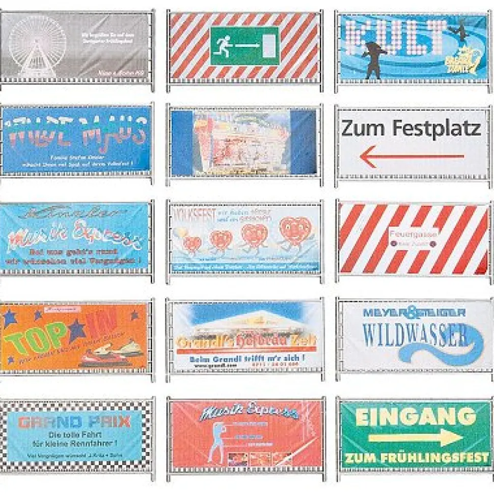 Modélisme accessoires de décor HO – Fête foraine : Clôtures et panneaux de barrage fête foraineClôtures barrières pour fête foraine avec bannières indicatrices et publicitaires ainsi que panneaux de champ de foire.Epoque : 1986 – 2006.Degré de difficultés : débutant.Longueur totale : 72 cm.Nombre de pièces : 84.