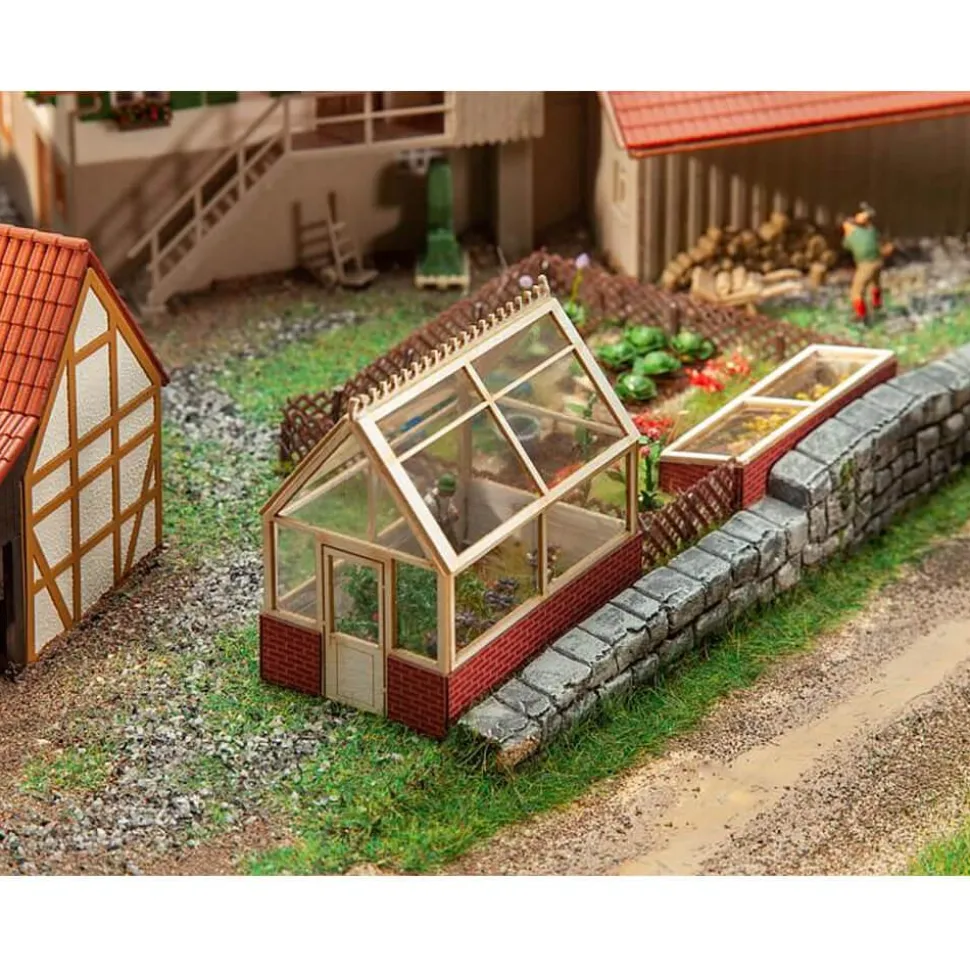 Pour jardiniers amateurs ! Modèle découpé au laser d’une petite serre en verre présentant une maçonnerie en briques servant de base et une structure en bois filigrane portant un toit à deux versants. Usages multiples. Échelle : HO.Dimensions : 49 x 31 x 48 mm