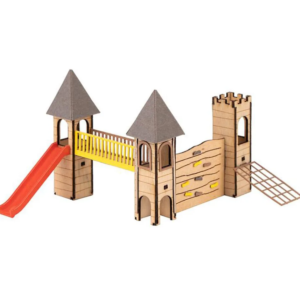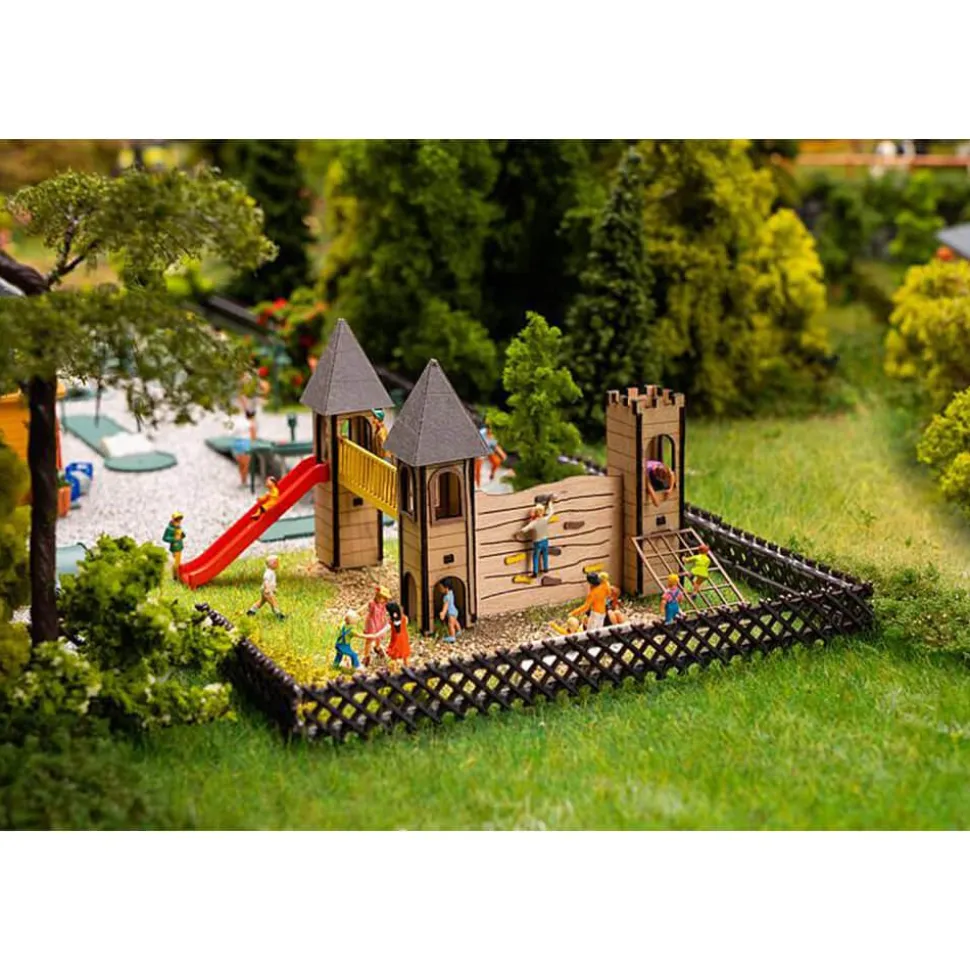 Modélisme HO de marque Faller : Aire de jeu.Coffret d’aire de jeu incluant trois tours de jeu couronnées de toits ou de créneaux, pont, toboggan, mur d’escalade et filet d’escalade.Échelle : 1/87.