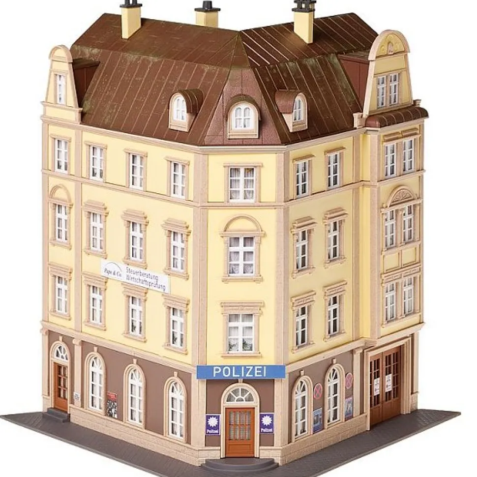 Commissariat urbain avec accès de garage sur un terrain d’angle. Façade de bâtiment ancien à la structure vivante avec encadrements massifs de fenêtres et combles et lucarnes au dernier étage. Epoque : 1946 – 1977.Degré de difficultés : standard.Dimensions : 25 x 20.5 x 22.5 cm.Echelle HO = 1/87.