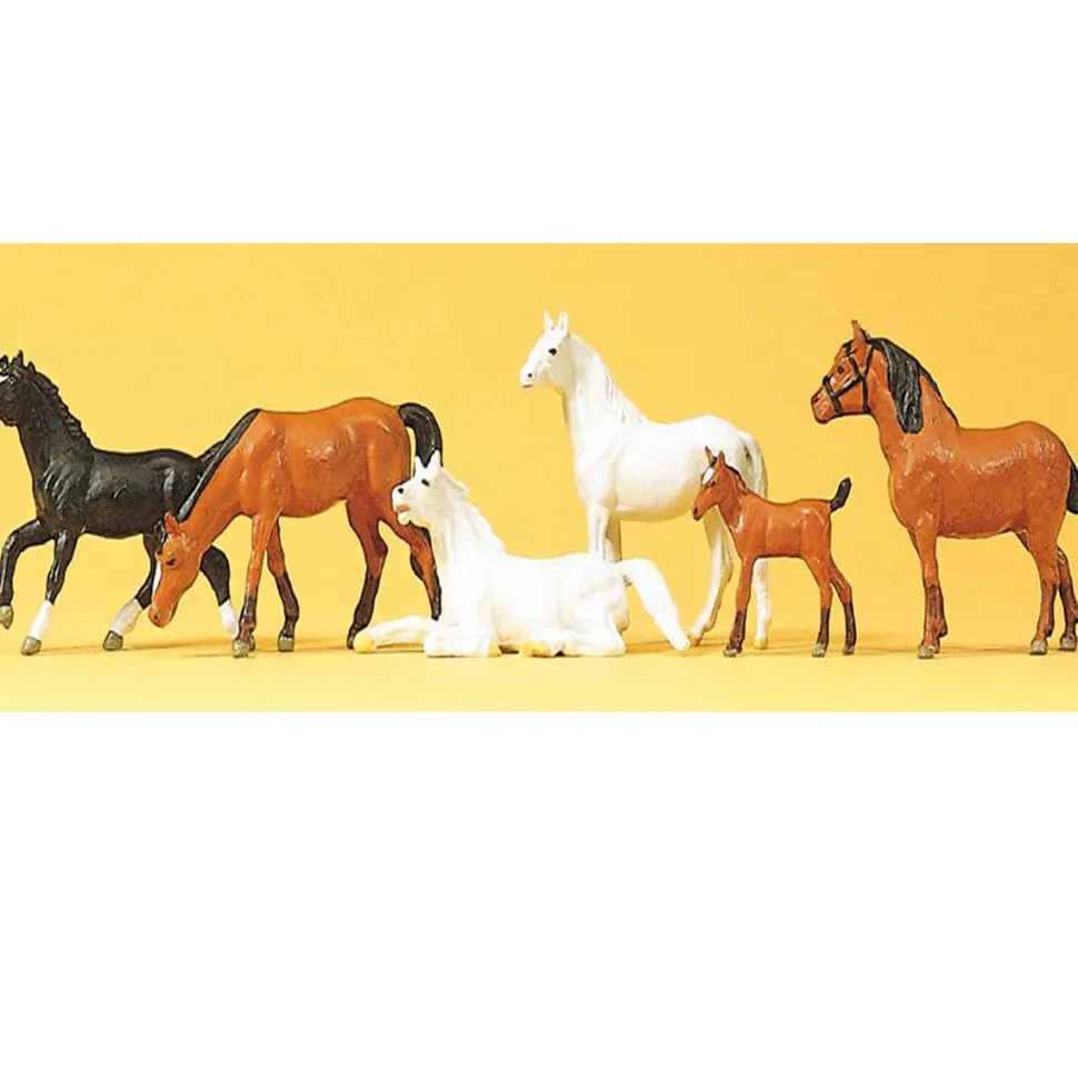 Retrouvez ces figurines animaux de la ferme : set de 6 chevaux.Pour donner à un circuit un aspect vivant, il ne faut pas oublier un détail essentiel : les gens et les animaux. Avec les différents coffrets de figurines Preiser, vous pouvez mettre en scène des situations comme dans la vie réelle, authentiques jusque dans les derniers détails et pleines de réalismes.Les chevaux et les humains ont une relation ancienne. Les chevaux occupent toujours une place d’honneur dans de nombreuses cultures, souvent liées à des exploits héroïques en temps de guerre. Il n’y a qu’une seule espèce de cheval domestique, mais environ 400 races différentes qui se spécialisent dans tout, que ce soit pour tirer une charrue ou pour gagner une course. Aujourd’hui, le cheval de trait revient dans les exploitations viticoles et maraichères pour travailler la terre de façon «douce » : c’est la traction animale.Echelle HO = 1/87.