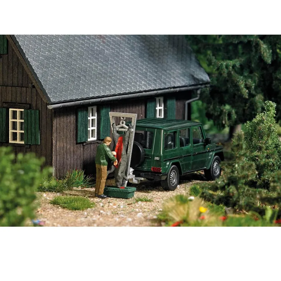 Set composé de : un véhicule de terrain avec aide au démontage, un gibier, un chasseur, un bac à gibier.