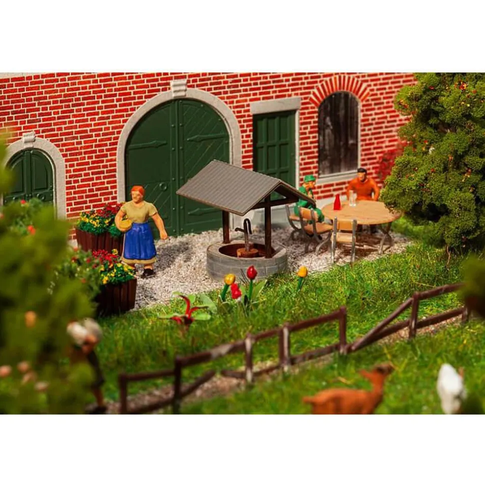 L’élément central d’un jardin ou d’une place de village ! Modèle découpé au laser d’une fontaine décorative maçonnée avec toit de protection et pompe à eau. Modèle sans fonctionnement.