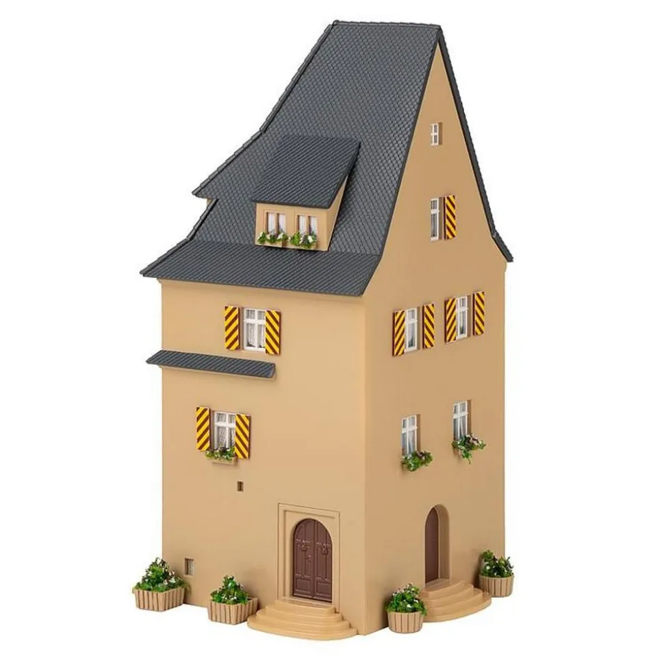 Immeuble urbain ayant l’aspect d’une tour, à trois étages, façade crépie et toit en croupe raide avec lucarnes. Le kit inclut des volets et des bacs à fleurs ornementaux assurant la décoration. Le modèle peut se construire séparément ou au début d’une rangée d’immeubles.