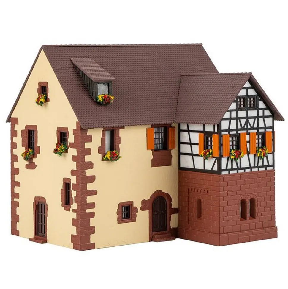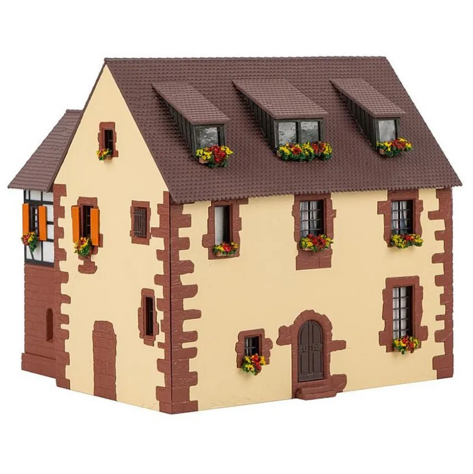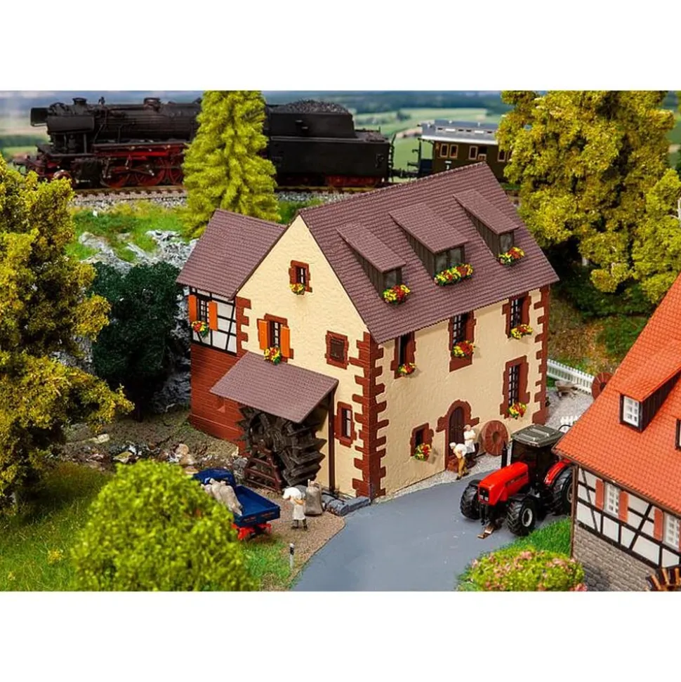 Moulin à deux étages, pierres de taille aux angles et piédroits des portes et fenêtres en pierres naturelles taillées dégagées du crépi, ainsi qu’une construction annexe à pans de bois du côté mur gouttereau avec pierres apparentes au rez-de-chaussée. Le modèle permet d’installer la roue à aubes côté pignon de façon qu’elle soit entrainée d’au-dessus ou d’en-dessous, ce qui laisse le choix pour l’aménagement du cours d’eau. Quelques vieilles meules de moulin servent de décoration sur la façade frontale. Pour entrainer la roue, on peut utiliser en option le »Moteur synchrone«, Art. 180629 (non fourni).