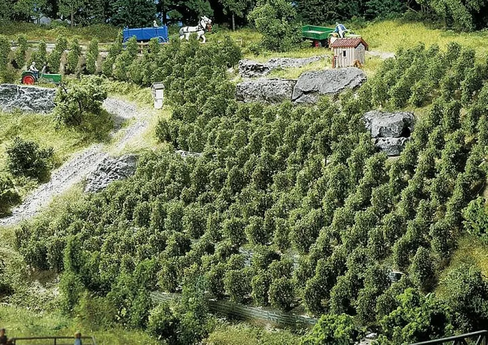 Un arbre seul n’a jamais constitué une forêt, c’est pourquoi vous trouverez une collection de différentes sortes d’arbres, parfois entièrement verts, parfois au feuillage d’automne, quelquefois même prêts pour la récolte. Les arbres donnent une certaine structure au paysage, les haies délimitent les champs et les buissons ne décorent pas uniquement les jardins. Ils sont des éléments indispensables du monde miniature. Ceps avec échalas à planter.Hauteur : 3 cm.Convient pour échelles HO (1/87), TT (1/120) et N (1/160).