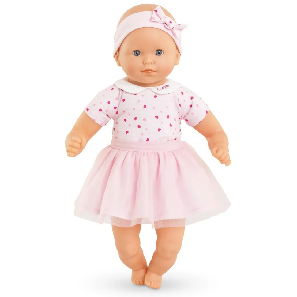 Habillé du joli tissu de sa toile de corps qui arbore des petits coeurs de différentes teintes de rose, Mon Adorable Petit Poupon Coeur se distingue par son col claudine raffiné, orné du logo Corolle, cousu autour de son cou. Il possède également un tutu en tulle tout doux qui est amovible pour varier les tenues ! Le tout est complété par un bandeau assorti qui ajoute une touche finale à ce look plein de tendresse.